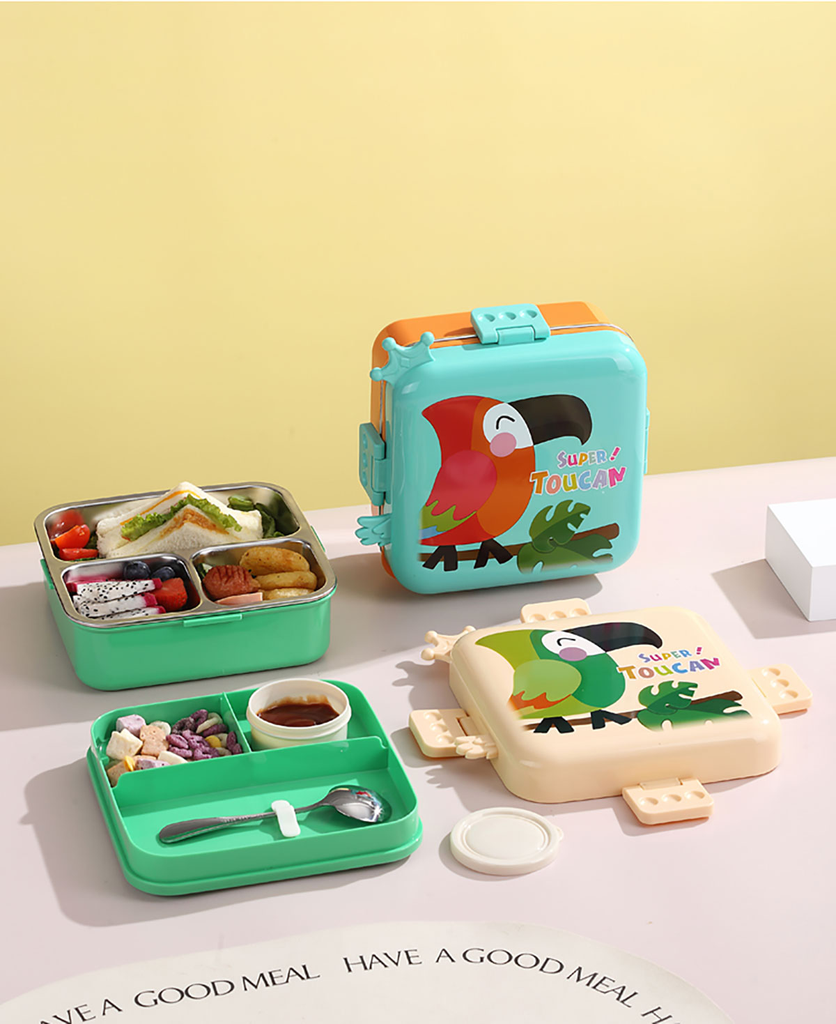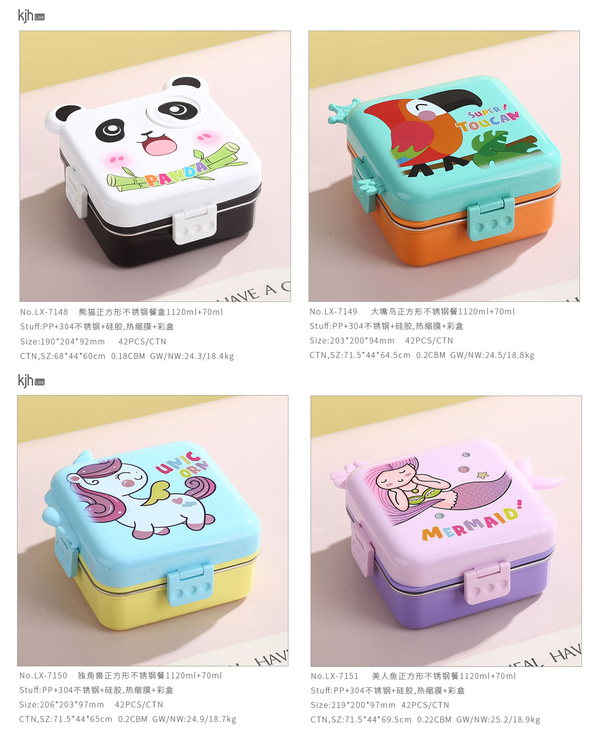 熊貓/大嘴鳥/獨(dú)角獸/美人魚正方形不銹鋼餐盒1120ml+70ml