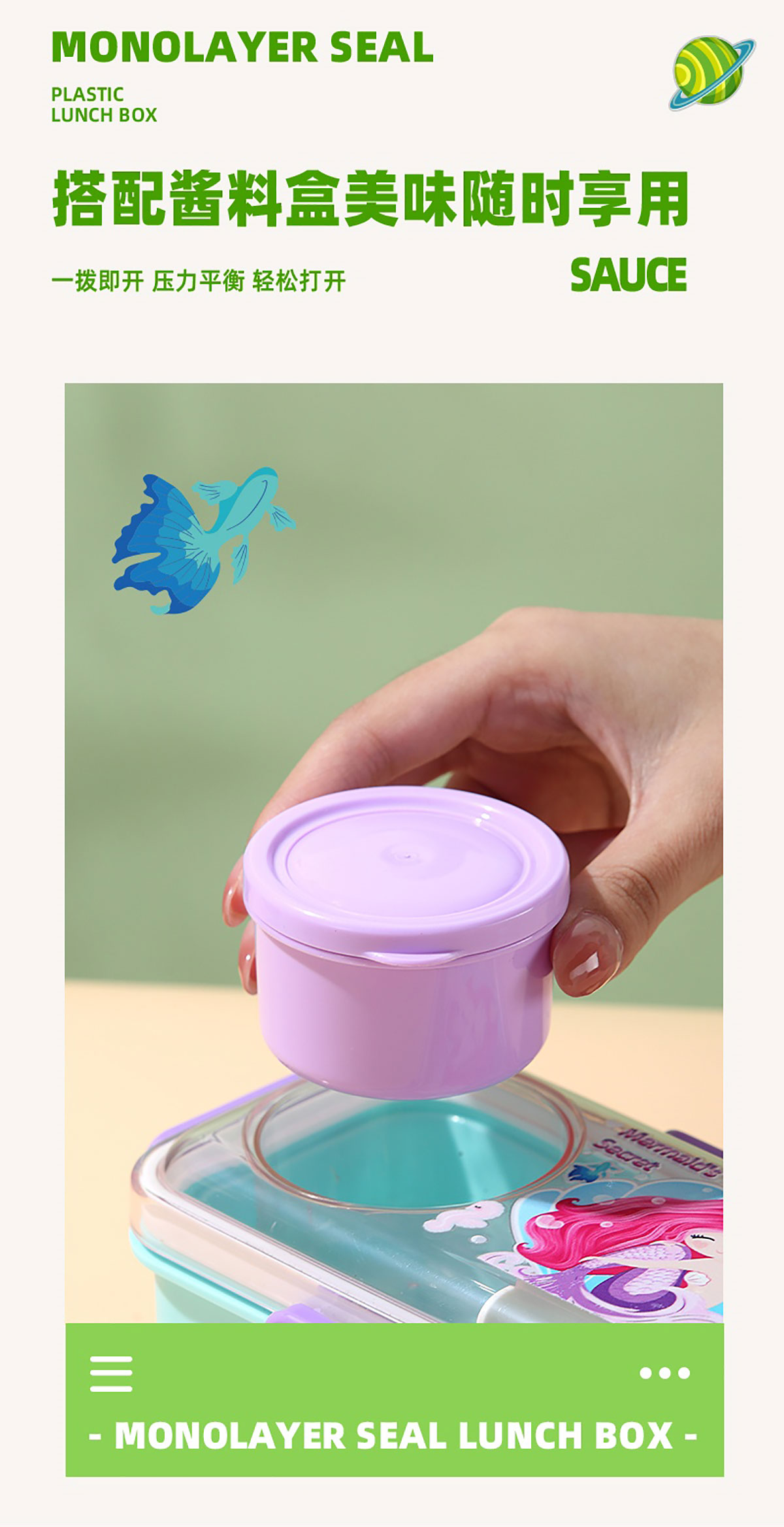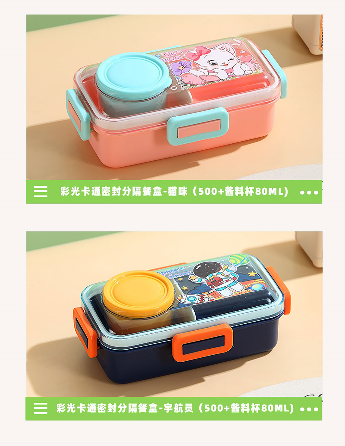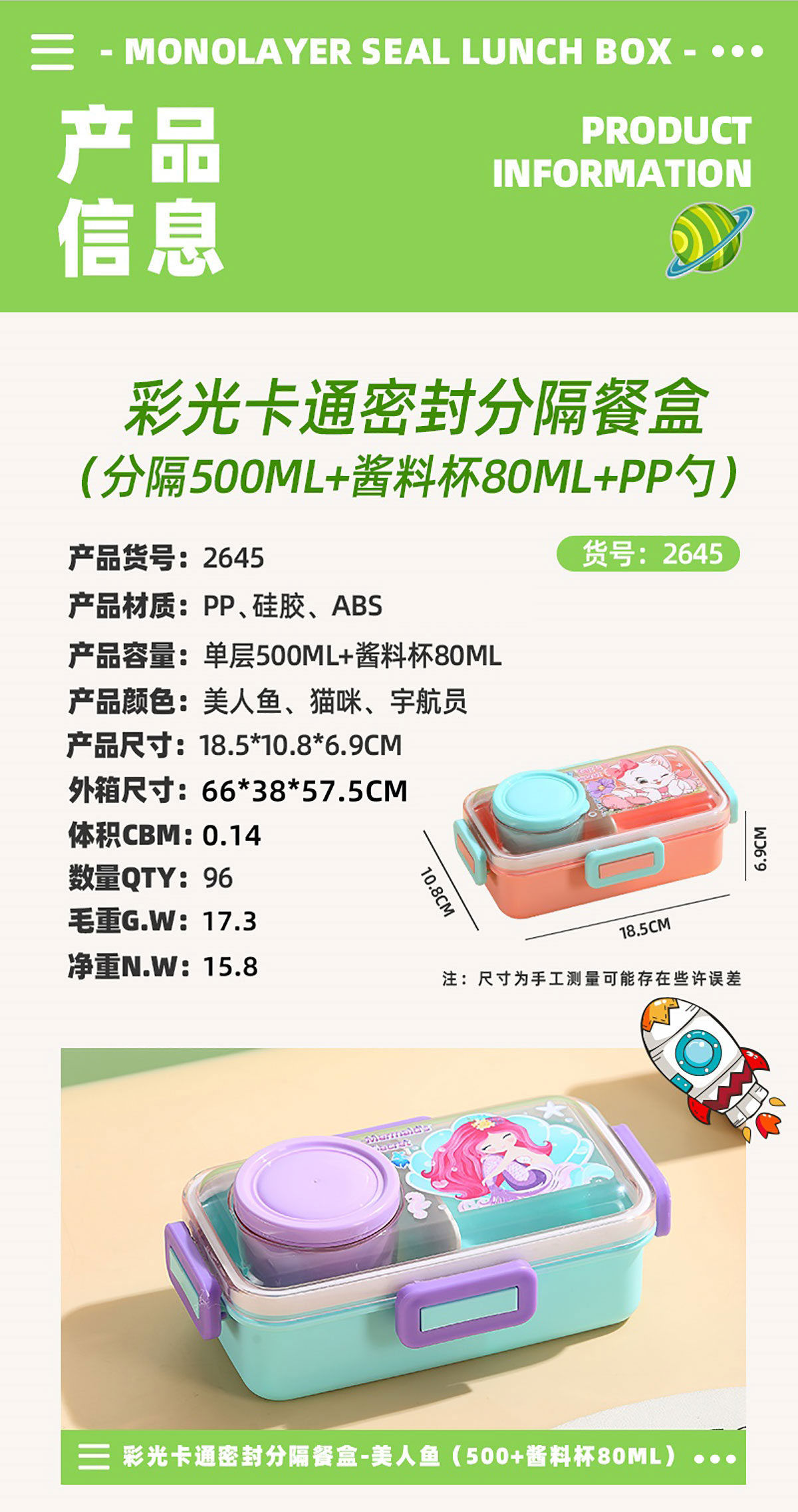 彩光卡通密封餐盒(單格500ml+外置醬料杯80ml+pp勺)