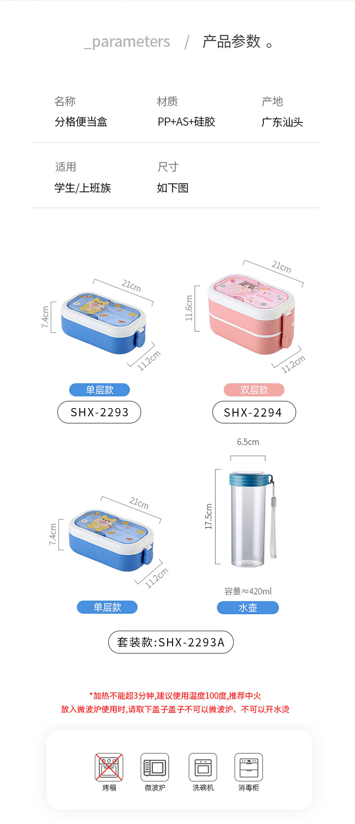 SHX-2293A(單層套裝):飯盒:210*112*74mm 水杯:Φ65*175mm